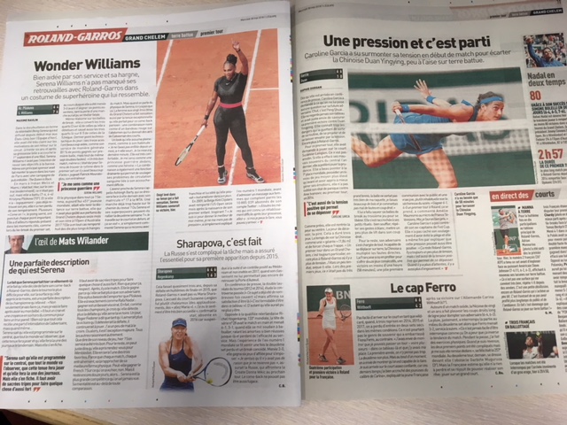 Ampio spazio del quotidiano transalpino L’Equipe sui due ex n. 1 del mondo e Tommy Haas, secondo coach di Lucas Pouille. Ha fatto sensazione la nuova mise di Serena, tant’è che il quotidiano titola “Wonder Williams” il pezzo a lei dedicato. La tutina da “Catwoman” porta bene all’ex n. 1 del mondo che, indossandola, si sente “una principessa guerriera, un’eroina. Non l’avevo indossata da un mese e l’ho messa ieri all’ultimo momento. È davvero molto comoda“.