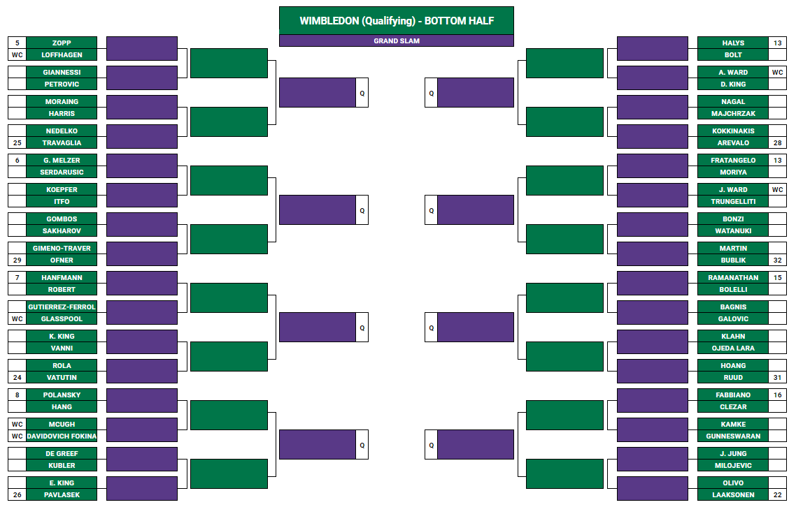Discreto tabellone per Stefano Travaglia, testa di serie n.25, che inizia il suo cammino contro il russo Ivan Nedelko (n. 242), così come per Luca Vanni che ha chance contro l’americano Kevin King (n.174). Buon primo turno per Lorenzo Sonego, insignito della testa di serie n.12, che affronta il ceco Safranek (n.255), anche se nel suo percorso verso i Championships ci sarà probabilmente Ernest Gulbis, testa di serie n.27. Poca fortuna per Simone Bolelli, che sull’erba si è sempre difeso egregiamente, ma che ha pescato l’indiano Ramkumar Ramanathan, testa di serie n.15 e decisamente abituato al gioco sui prati. Chance di qualificazione infine anche per Thomas Fabbiano, inserito in tabellone con la testa di serie n.16 e che affronterà al primo turno il brasiliano Clezar (n.191).