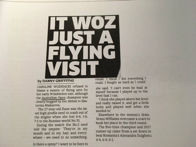 Toccata e fuga per Caroline Wozniacki a Wimbledon. La n. 2 del mondo ieri ha perso al secondo turno per mano di una solida Ekaterina Makarova (6-4 1-6 7-5 lo score), n. 35 WTA. Una prestazione al di sotto delle aspettative e del suo livello per Caro che, in particolare, è stata molto infastidita dalla presenza di numerose formiche volanti in campo. Mercoledì, in effetti, la giornata era alquanto umida (tant’è che poi è piovuto con conseguente sospensioni dei match) e le moleste formichine si sono scatenate “Ce le ho in bocca, nei capelli e dovunque. Dobbiamo fare qualcosa. C’è uno spray? Sono qui per concentrarmi sul tennis e non per mangiare insetti” protestava con il giudice di sedia un’indispettita Caroline.