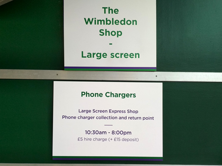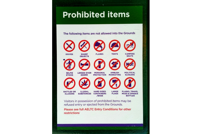 All’ingresso dei diversi cancelli di Wimbledon sono esposti cartelli che spiegano cosa è vietato portare all’interno del circolo. Probabilmente la selezione è frutto dell’esperienza degli anni passati, perché ovviamente non è possibile elencare tutte le cose che potrebbero essere non ammesse. C’è quindi da ritenere che quelli elencati siano gli oggetti che più spesso il pubblico ha provato a far entrare e che gli organizzatori non permettono. Ecco il cartello: