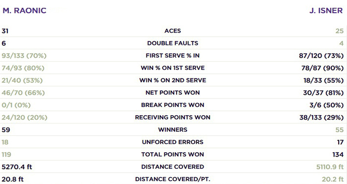2 ore e 42 minuti di gioco, in cui Isner ha concesso (e salvato) una sola palla break. Ace/doppi falli: Isner 25/4, Raonic 31/6. Ora per Isner il confronto con Anderson, vincitore a sorpresa contro Federer. Sicuramente ci attende un’altra grande battaglia di servizi.