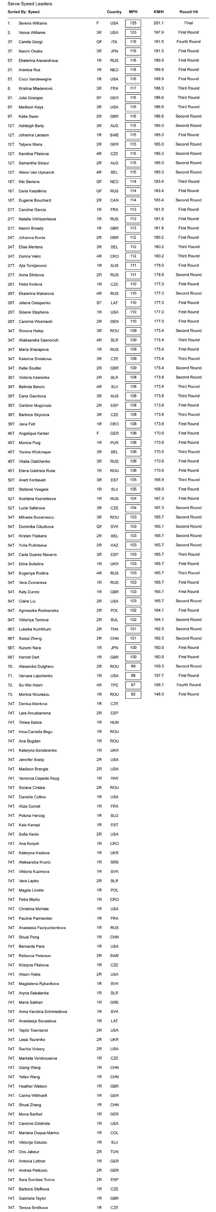 Quest’anno è tornata Serena Williams, e si è ripresa il primato di velocità, migliorando di un miglio la punta registrata nel 2016 (124 mph) quando aveva vinto il torneo. Da notare il terzo posto di Camila Giorgi, che dimostra come per servire rapido non sia necessario essere altissime (anche se indubbiamente aiuta).