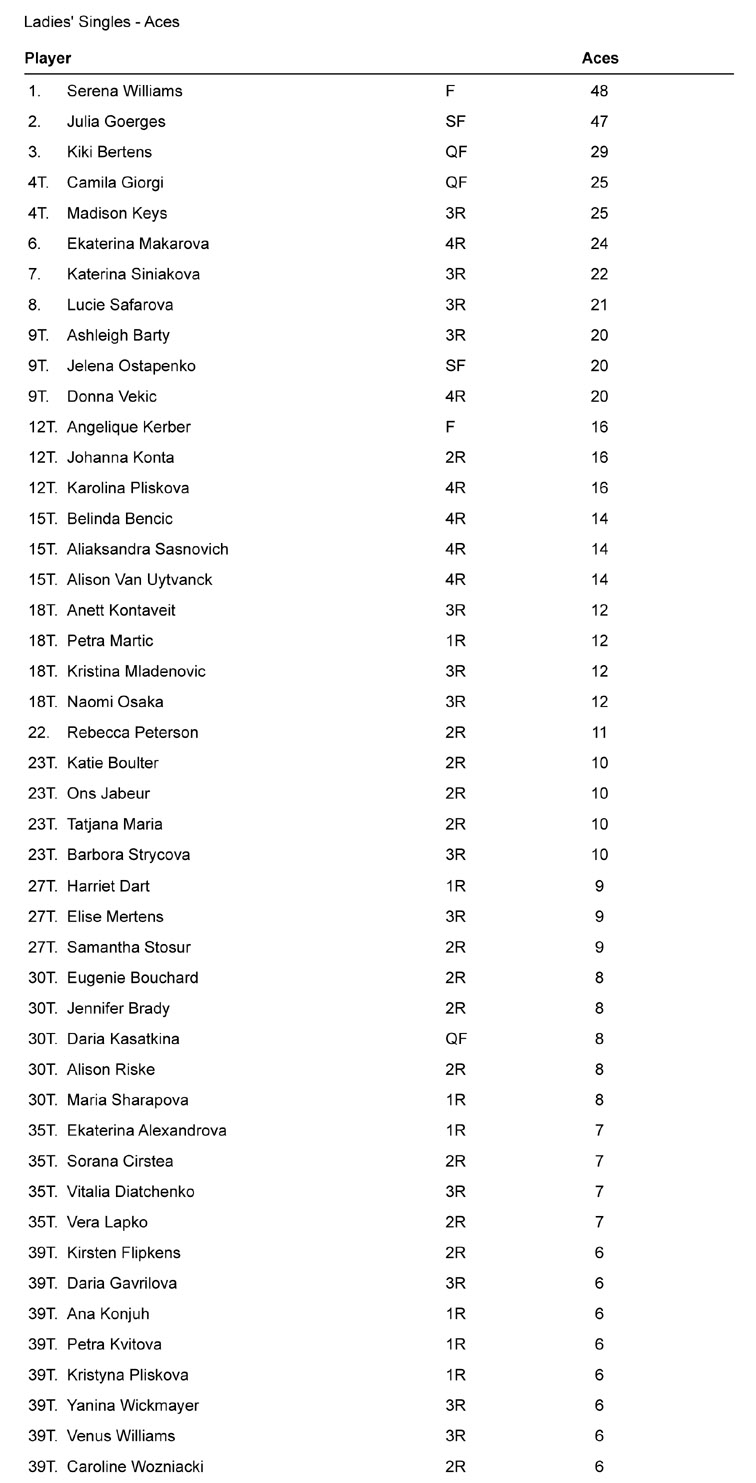 Sia per gli ace che per i doppi falli un avvertimento: questi non sono valori ponderati, ma la pura somma degli ace e dei doppi falli ottenuti. Dunque chi ha giocato più match ha avuto più occasioni per aumentarne il numero (di ace, come di doppi falli). E così i 25 ace di Madison Keys e i 22 di Katerina Siniakova ottenuti in tre partite, probabilmente non valgono proporzionalmente meno dei 48 di Serena (in 7 match). Per non parlare dei 12 di Martic in un solo impegno. Dico probabilmente perché per avere il dato certo andrebbe calcolato il numero di ace per ogni servizio effettuato.