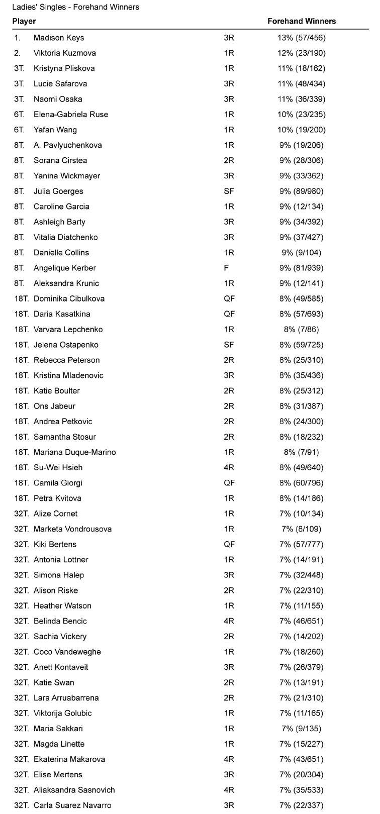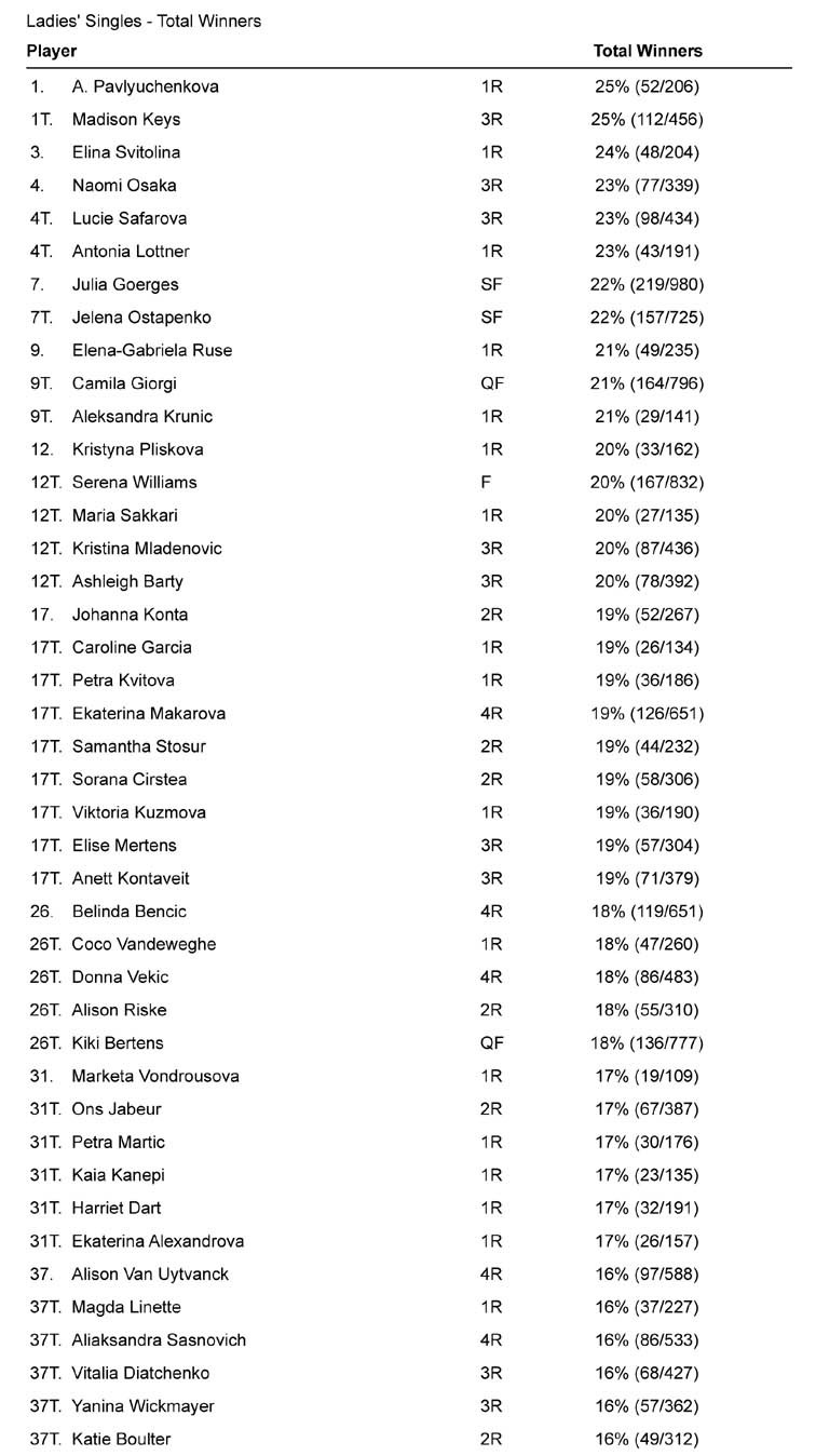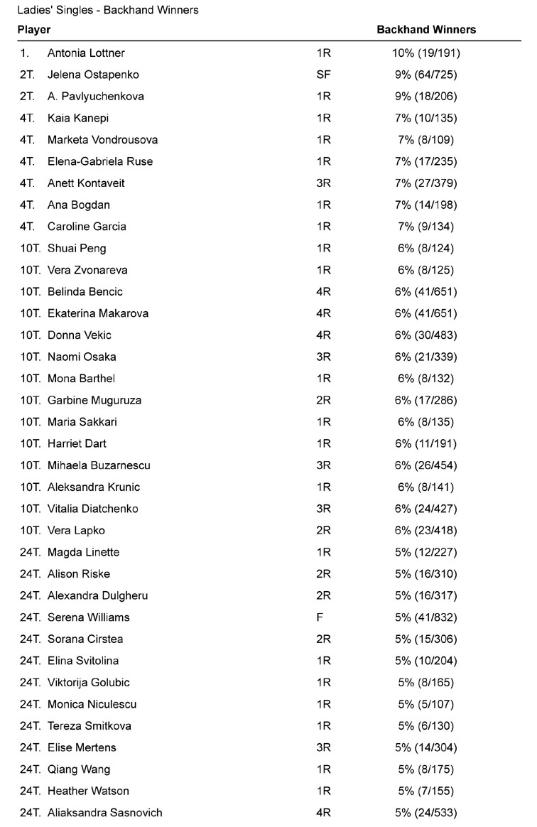 Dati scorporati: vincenti di dritto. Credo non ci si possa sorprendere se comandano (tra chi ha più di un match) Keys, Safarova e Osaka. Mentre tra chi è approdata alla seconda settimana spicca il dritto di Julia Goerges (9,0%). Arrotondata al 9% ma con un valore effettivamente un po’ inferiore anche Kerber (8,6%) e il suo fido dritto lungolinea: