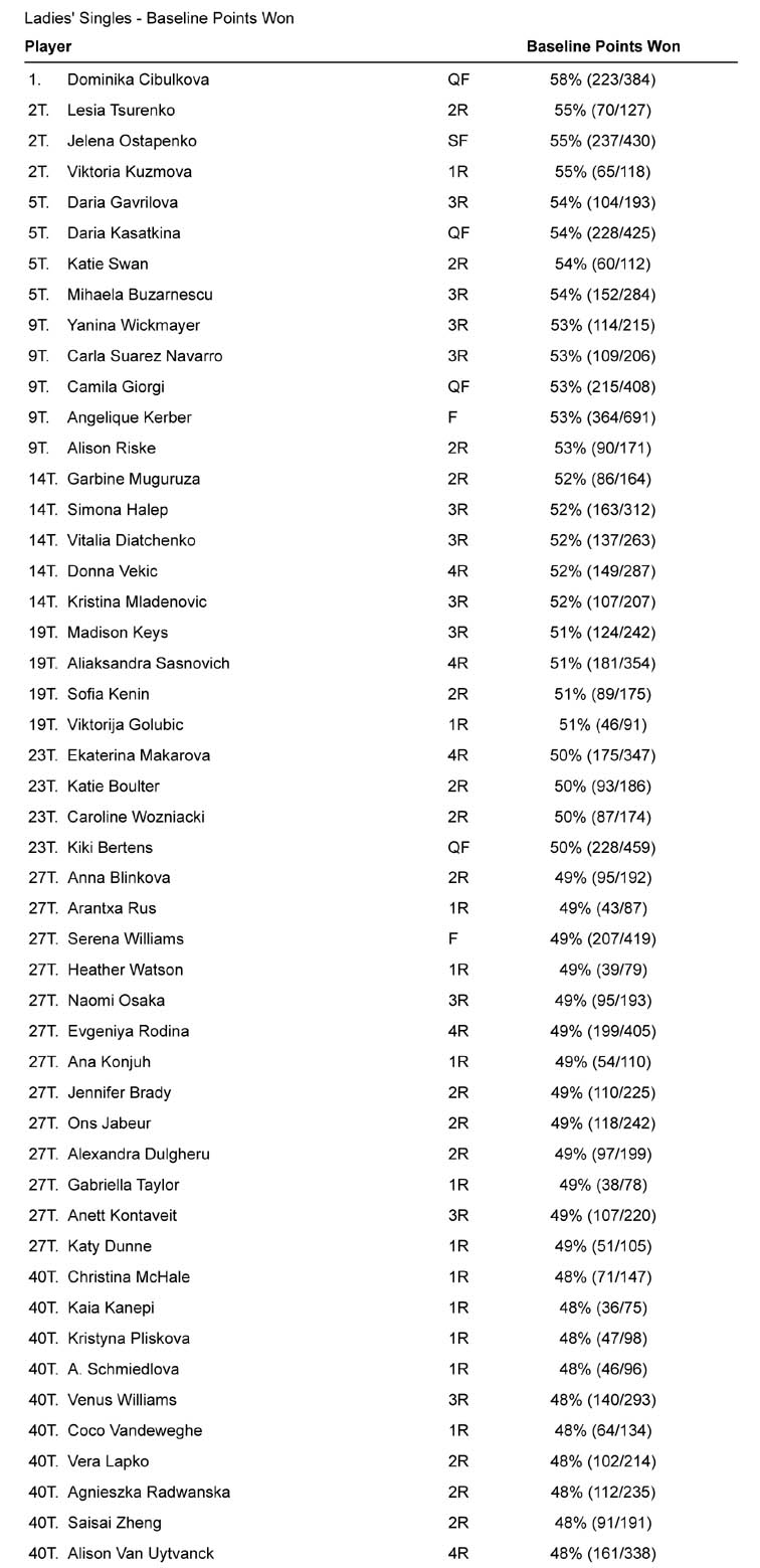 Se invece ci si chiedeva come abbia fatto Cibulkova ad arrivare sino ai quarti di finale, malgrado un torneo non ai massimi livelli al servizio (Dominika in passato ha dimostrato di saper servire meglio), nella prossima statistica abbiamo la risposta: l’ottima percentuale di punti vinti da fondo, con il 58%. Molto bene anche Ostapenko, Kasatkina Giorgi e Kerber (tra il 53 e il 55%). Tra chi è approdata nei quarti di finale, nei piani alti di questa classifica manca solo Goerges, ferma al 47%.