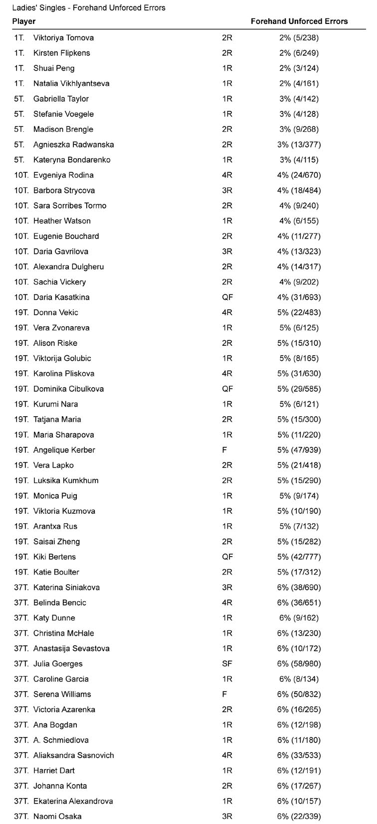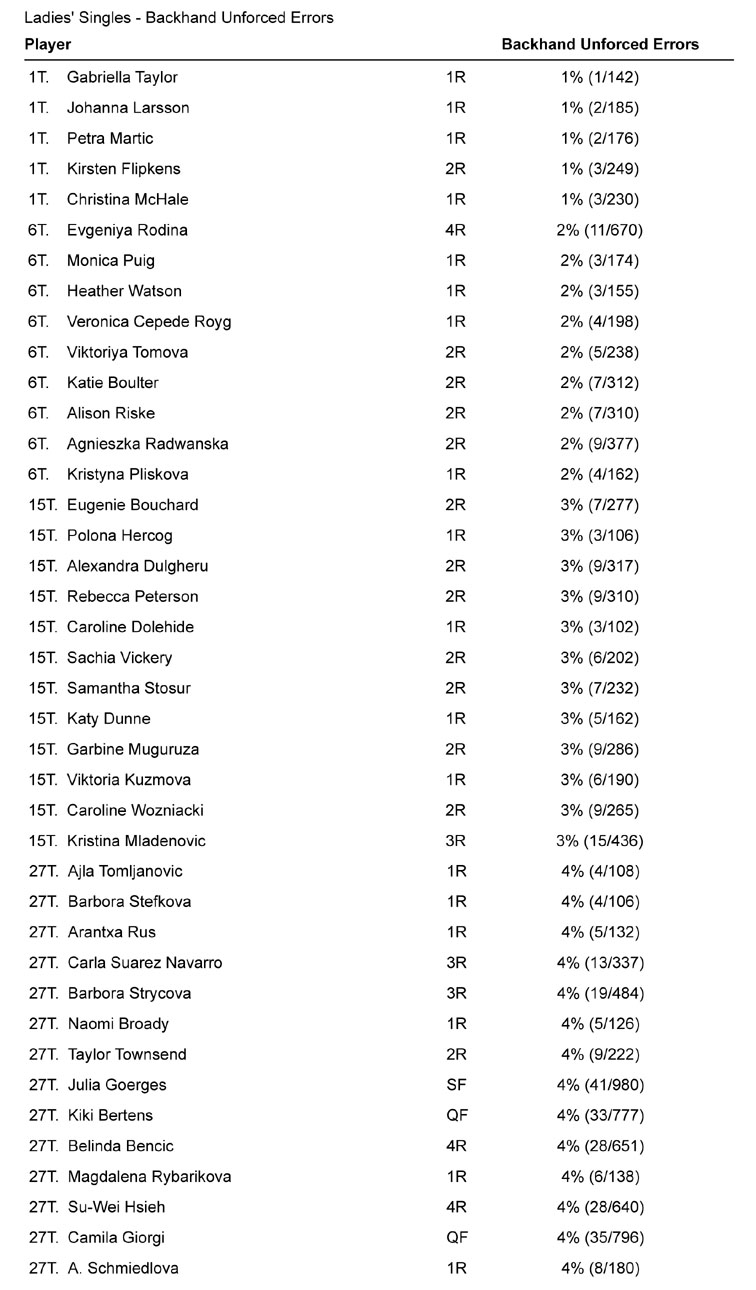 Infine gli errori non forzati di rovescio. Di tutte le statistiche è quella per me più inattesa. Tra chi è arrivata come minimo al quarto turno comanda ancora Rodina, ma poi è addirittura seguita da Goerges e Bertens (4%, come Giorgi) che in questo torneo non hanno regalato nulla di rovescio, il loro colpo storicamente più debole. Un elemento in più per capire come abbiano potuto raggiungere il miglior risultato di carriera in questi Championships.