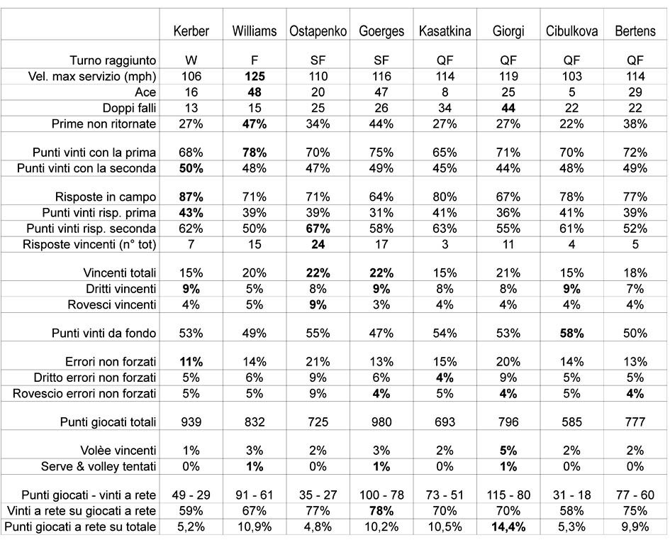 Ultima tabella. Rappresenta un tentativo di rielaborazione dei dati di Wimbledon, in modo da poter confrontare sinteticamente il rendimento delle otto giocatrici approdate ai quarti di finale. Dai numeri emergono chiaramente gli stili di gioco: Williams, Ostapenko, Goerges e Giorgi eccellono negli aspetti offensivi. Sono loro quattro ad avere ottenuto almeno il 20% di vincenti, mentre Kerber, Kasatikina e Cibulkova si fermano al 15%, con Bertens a metà strada (18%).