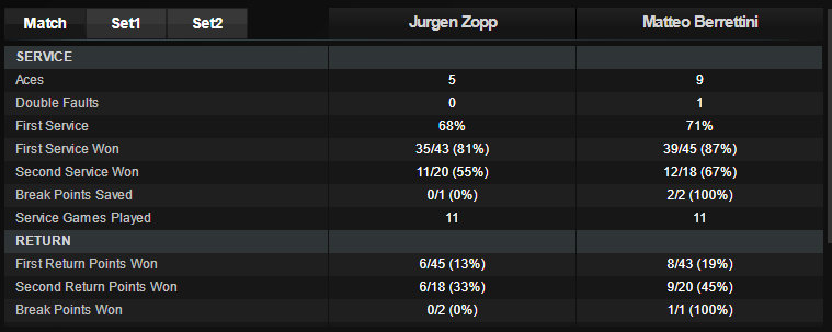 Secondo parziale in controllo per entrambi i giocatori, l’estone è un maestro della rimonta (sia con Hanfmann sia con Bagnis ha perso il primo set), ma Matteo è granitico al servizio, non lo ha ancora perso in tutto il torneo. Si seguono i servizi, solidi per entrambi e senza palle break concesse, Berrettini raggiunge 6 a 6 il suo avversario. Tie break: serve Zopp, si scambia e Berrettini non tiene, 1 a 0. Ace e kick di seconda per il 2 a 1 italiano, Zopp spinge e si porta 3 a 2. Berrettini 4 a 3 con smash e l’estone al servizio deve replicare: prima seguita a rete, passantone secco di dritto di Matteo e la tribuna ruggisce 5 a 3 Berrettini. Ecco due match point per l’italiano sul 6 a 4 e servizio e per la prima volta nel torneo sente la pressione e va fuori con il dritto. Poi altro gratuito per il 6 a 6. Matteo recupera subito dal momento di sbandamento, dritto profondo su servizio estone e smorzata dopo scambio su proprio servizio ed è “forza!”: 8 a 6 e partita chiusa 6-4 7-6(6). Finale raggiunta e sognare non è mai sembrato così reale.