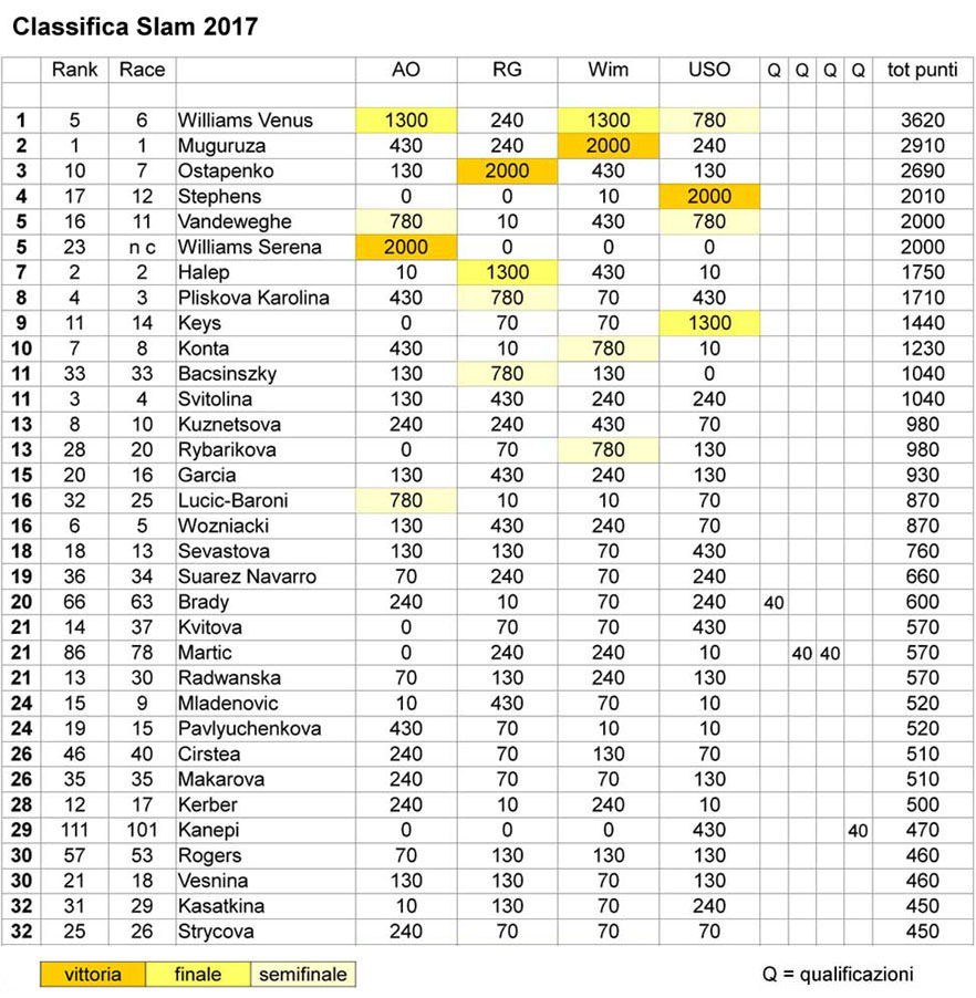 Se confrontiamo la classifica Slam 2018 con quella del 2017 (vedi anche QUI) si notano alcuni aspetti interessanti. Ecco i dati dello scorso anno: