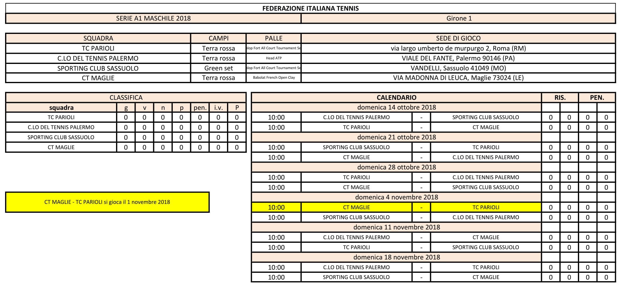 Nel girone 1, il Circolo Tennis Club Palermo Due ospiterà il neo promosso Sporting Club Sassuolo, mentre il TC Parioli, finalista della passata edizione, affronterà il Circolo Tennis Maglie.
