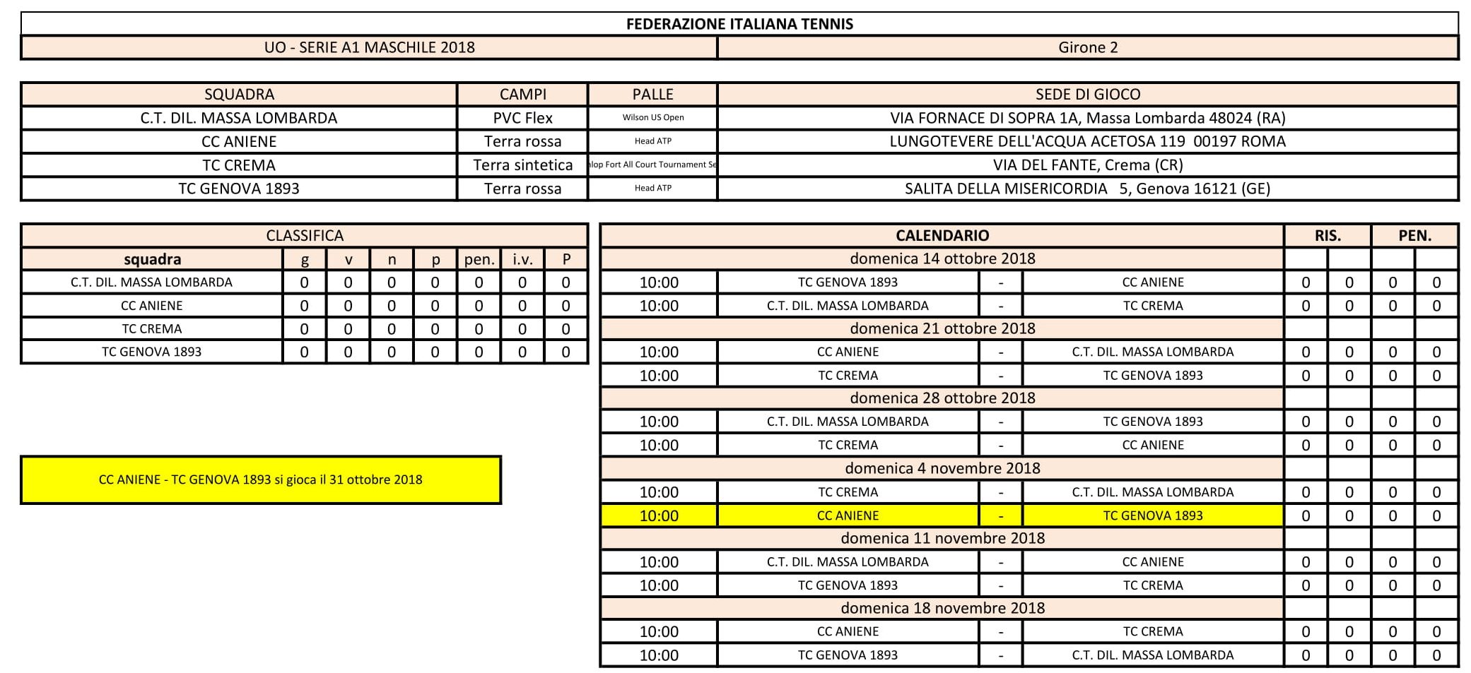 Inserita nel girone 2, i campioni in carica del Circolo Canottieri Aniene esordiranno in casa del Tennis Club Genova 1893. L’altra sfida del girone vedrà opposti il Circolo Tennis Massa Lombarda e il Tennis Club Crema.