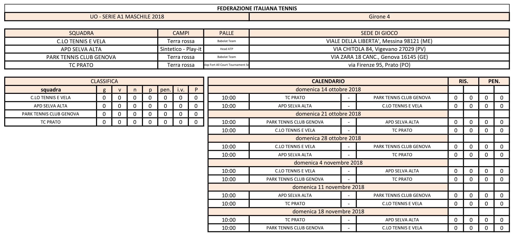 Infine il girone quattro si aprirà con l’affascinante sfida tra il Tennis Park Genova e il TC Prato. parallelamente il Selva Alta Vigevano se la vedrà con il Circolo Tennis e Vela Messina.
