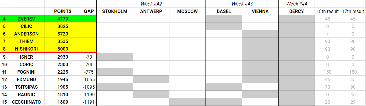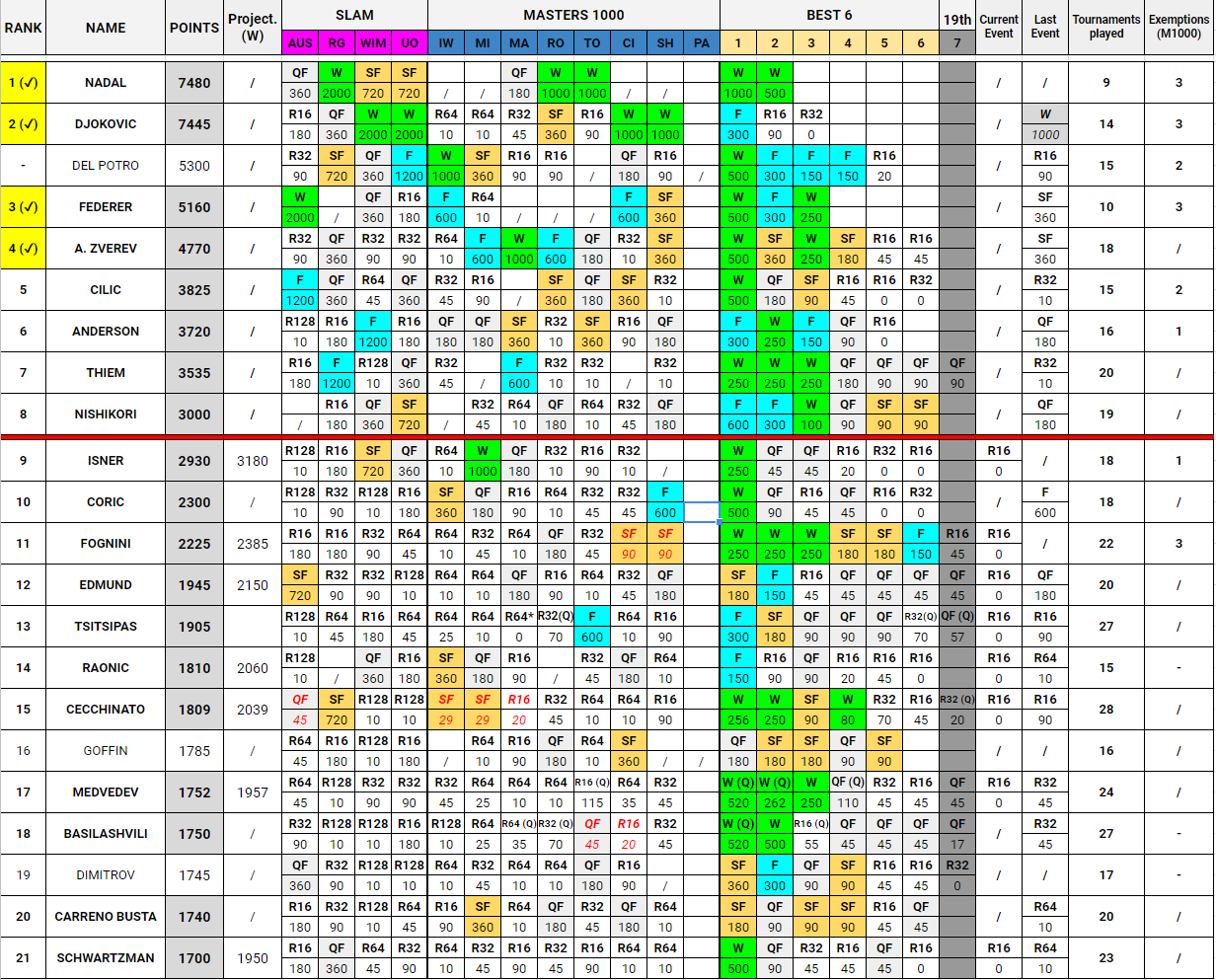 Considerando quindi che Isner è praticamente incollato a Nishikori e già questa settimana può contro-sorpassarlo (gli serve la semifinale a Stoccolma), gli unici inseguitori credibili sono proprio lui e Coric, le cui possibilità sono comunque molto ridotte e legate a due grossi risultati nelle prossime settimane.