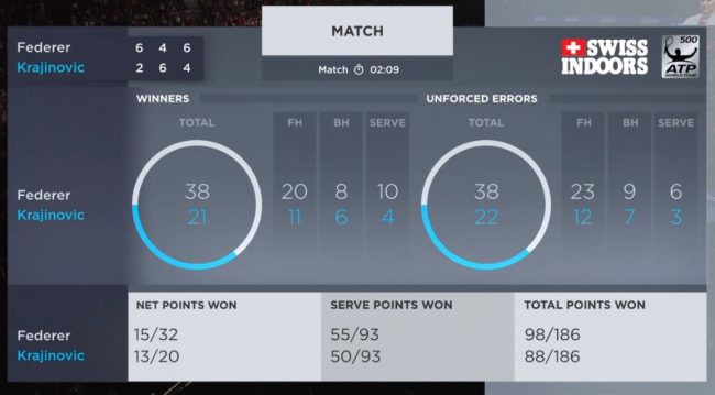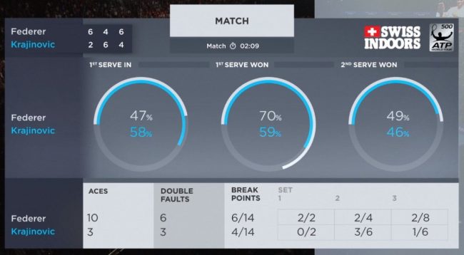 MEZZO SERVIZIO – Federer la spunta dopo 2h09 di partita, un match che ha avuto una serie interminabile di capovolgimenti a causa della scarsa vena (per usare un eufemismo) del campione di Basilea. Federer ha servito per larghi tratti del match intorno al 40% di prime palle, riuscendo solo nel finale a riportare il dato a un poco più accettabile 47%.