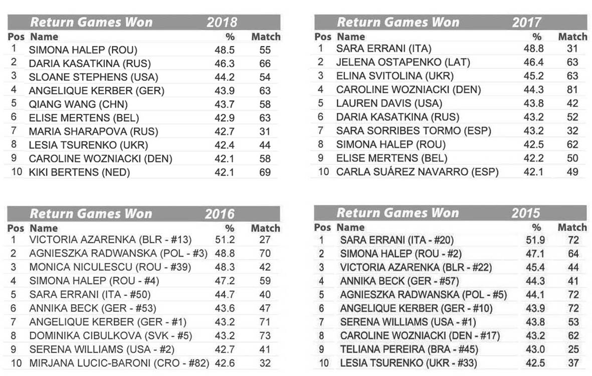 Dopo due anni al primo posto e uno al quinto, esce dalla classifica Sara Errani: nel 2018 il suo dato è sceso al 41,9%, e così prende il comando la numero 1 del mondo Simona Halep.