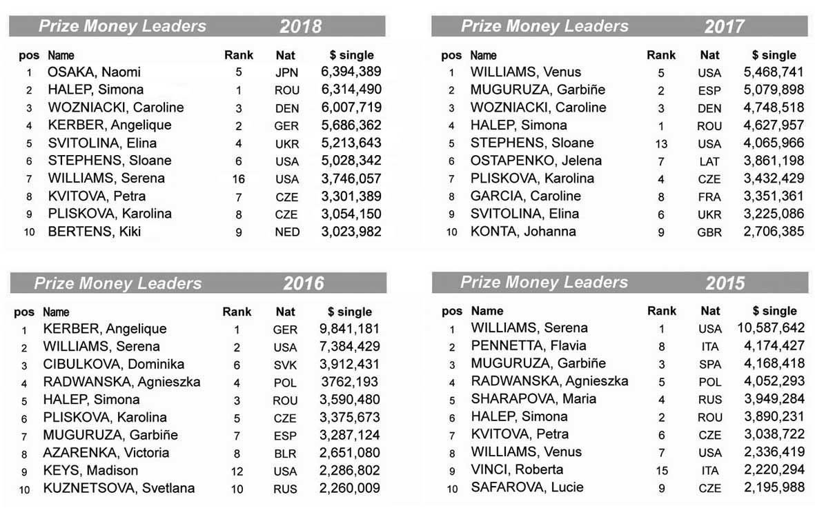Qui ne presento un’altra possibile, quella del montepremi. Una classifica che non è priva di valore tecnico, visto che di solito i tornei più importanti e prestigiosi sono anche quelli meglio pagati. Una precisazione: per definire questa lista sono calcolati solo i guadagni ottenuti nei tornei di singolare. Non compaiono quindi i premi di doppio, doppio misto e nemmeno i bonus che WTA distribuisce alle Top 10 (legati alle presenze), che a mio avviso sfalserebbero il senso del confronto.