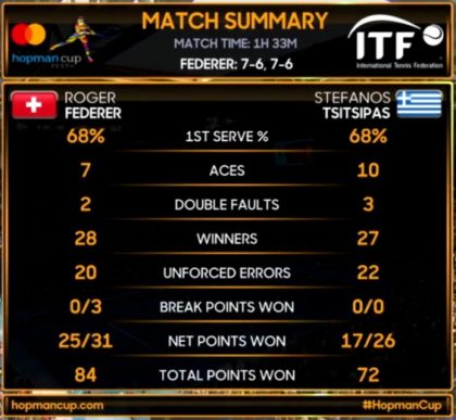 La vittoria di Federer in singolare rende inutili le vittorie della Grecia nel singolare femminile e nel doppio misto conclusivo. Maria Sakkari supera in due set Belinda Bencic e poi è grande protagonista nel misto vinto insieme a Tsitsipas. Sua la risposta decisiva al servizio di Federer nel tie-break decisivo. La Grecia vince dunque la sfida ma la Svizzera va in finale in virtù della miglior differenza tra match vinti e persi nel girone. Sabato la coppia elvetica giocherà dunque la finale e potrà difendere il titolo: potrebbe esserci una rivincita contro la Germania di Zverev e Kerber se usciranno vincenti venerdì dalla sfida contro i padroni di casa dell’Australia che schiera Ebden e Barty.