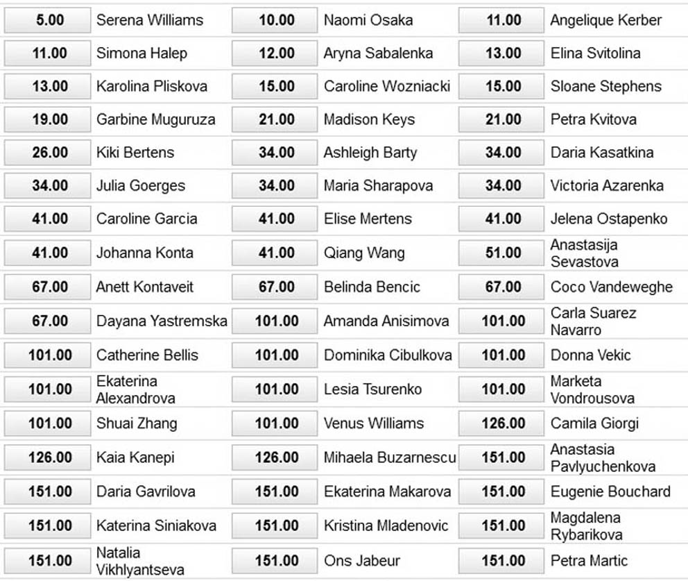 Per chiudere ecco le quote dei bookmaker. Quelle che presento sono di una delle principali agenzie, rilevate lunedì 7 gennaio. L’elenco è qui limitato alle giocatrici pagate fino a 151, ma ci sono all’incirca altrettanti nomi che seguono, quotati fra 201 e 501. E, a conferma di quanto dicevo all’inizio, ai vertici ci sono giocatrici di età diversissima: Serena 37 anni, Osaka 21, Kerber 30, Halep 27, Sabalenka 20, Svitolina 24, Pliskova 26 anni.
