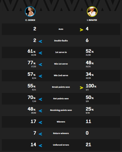 Giusto uno scambio di break all’inizio, con entrambe le ragazze che stanno adattandosi alle condizioni di gioco (freschetto e nuvoloso oggi, minaccia pioggia), e dal 2-2 del primo set Camila ingrana la marcia, saluta e se ne va, piazzando 10 game di fila, e archiviando la pratica per 6-2 6-0 in 59 minuti. Il suo ritmo è semplicemente non sostenibile per l’avversaria, Swiatek ci prova, fa vedere a tratti anche cose interessanti (qualche rovescio molto anticipato), oltre a questo serve bene (4 ace, e una ventina di “unreturned serves”, bottino interessante), ma per Giorgi in questo momento è poco più di una sparring partner. Quasi nulla da raccontare quindi, non sono match che ci permettono di valutare nessuna delle due. Portiamo a casa con piacere un’altra vittoria in scioltezza, siamo a 5 game lasciati in due match per l’azzurra, e 2 set vinti 6-0. Giorgi ora avrà Karolina Pliskova al terzo turno (precedenti, 4-1 Pliskova, ultima partita in favore di Karolina a Cincinnati nel 2017). Brava Camila, andiamo avanti e vediamo che succede.