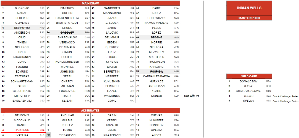Opelka e Young si sono guadagnati questo l’invito proprio grazie ai punti conquistati nella Oracle Challenger Series. Gli altri ad essere stati premiati sono invece due tennisti che al momento stanno mostrando grandi cose, seppur su una superficie differente (la terra rossa), e che tra di loro si sono contesi il titolo nella finale di Rio de Janeiro pochi giorni fa. Si tratta del 18enne canadese Felix Auger-Aliassime e del 23enne Laslo Djere, fresco di best ranking alla posizione n. 37 e in crescendo.
