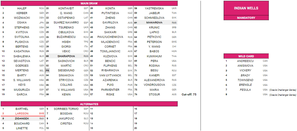 Per arricchire invece il tabellone femminile, che già così è strabordante di stelle – tutte le prime 30 presenti ad eccezione di Sharapova in convalescenza dopo l’operazione alla spalla – si è pensato bene di puntare sulle giovani e in particolare due wild card sono state concesse alla 17enne americana Amanda Anisimova (che quest’anno vanta gli ottavi di finale agli Australian Open) e alla 18enne Bianca Andreescu (vincitrice la settimana scorsa dell’Oracle Challenger Series di Newport e in campo anche questa settimana ad Acapulco).
