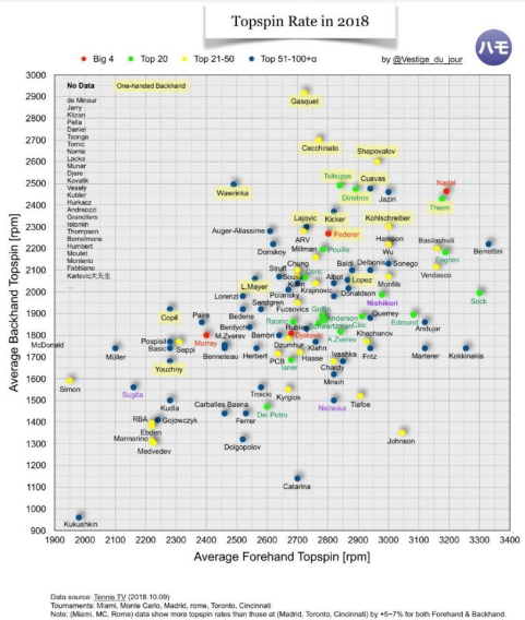 Esaminando le statistiche del 2018, si confermano molte tendenze del gioco di Cecchinato, soprattutto lo spin estremo che riesce a dare col rovescio. Che infatti è stato (e continua ad essere) uno dei suoi talloni d’Achille principali sul cemento.