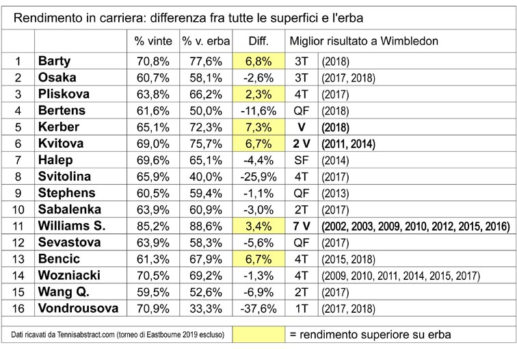 Prima di entrare nel dettaglio dei singoli nomi, ecco una tabella che spero possa aiutare nella valutazione delle prime sedici giocatrici. È riportato quanto hanno vinto in carriera su tutte le superfici e quanto invece su erba. La differenza tra percentuale di vittorie in carriera e percentuale di vittorie su erba dovrebbe evidenziare se a Wimbledon vanno considerate più o meno forti rispetto al loro rendimento complessivo.