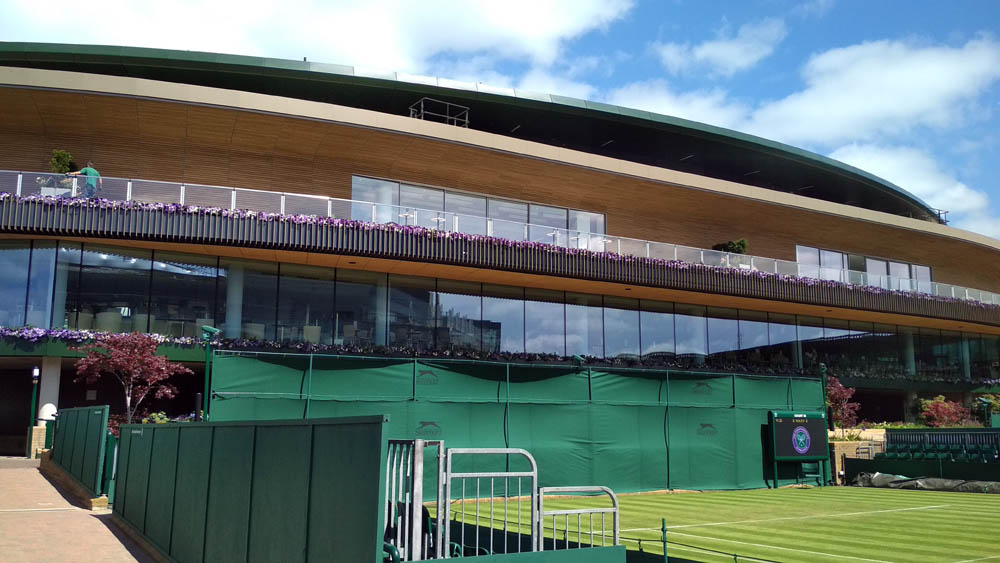 In questo 2019 l’esterno ha assunto la configurazione definitiva. Sono tre gli elementi ricorrenti utilizzati: vetro, legno e vegetazione. Parapetti e box vetrati caratterizzano il piano intermedio; alcune porzioni di muri esterni e tutti gli intradossi delle solette sono in legno; mentre i vasi di fiori con la classica combinazione di colori di Wimbledon scandiscono i principali livelli dell’edificio. Ecco una immagine del versante sud, che si affaccia verso i campi secondari: