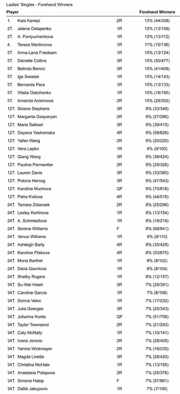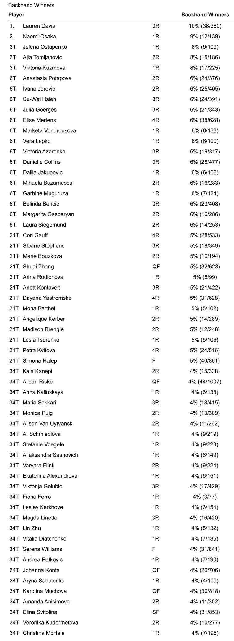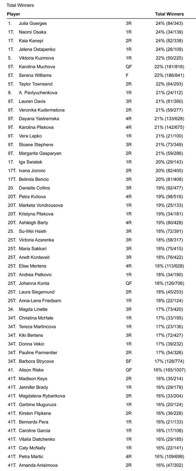 Il dato è correttamente indicato in percentuale, e vede ai vertici giocatrici ampiamente attese: Goerges, Osaka, Kanepi, Ostapenko. La sorpresa è forse la presenza tra le prime dieci di Lauren Davis, che ha messo a segno moltissimi vincenti nella seconda parte di match vinto contro una spenta Angelique Kerber.