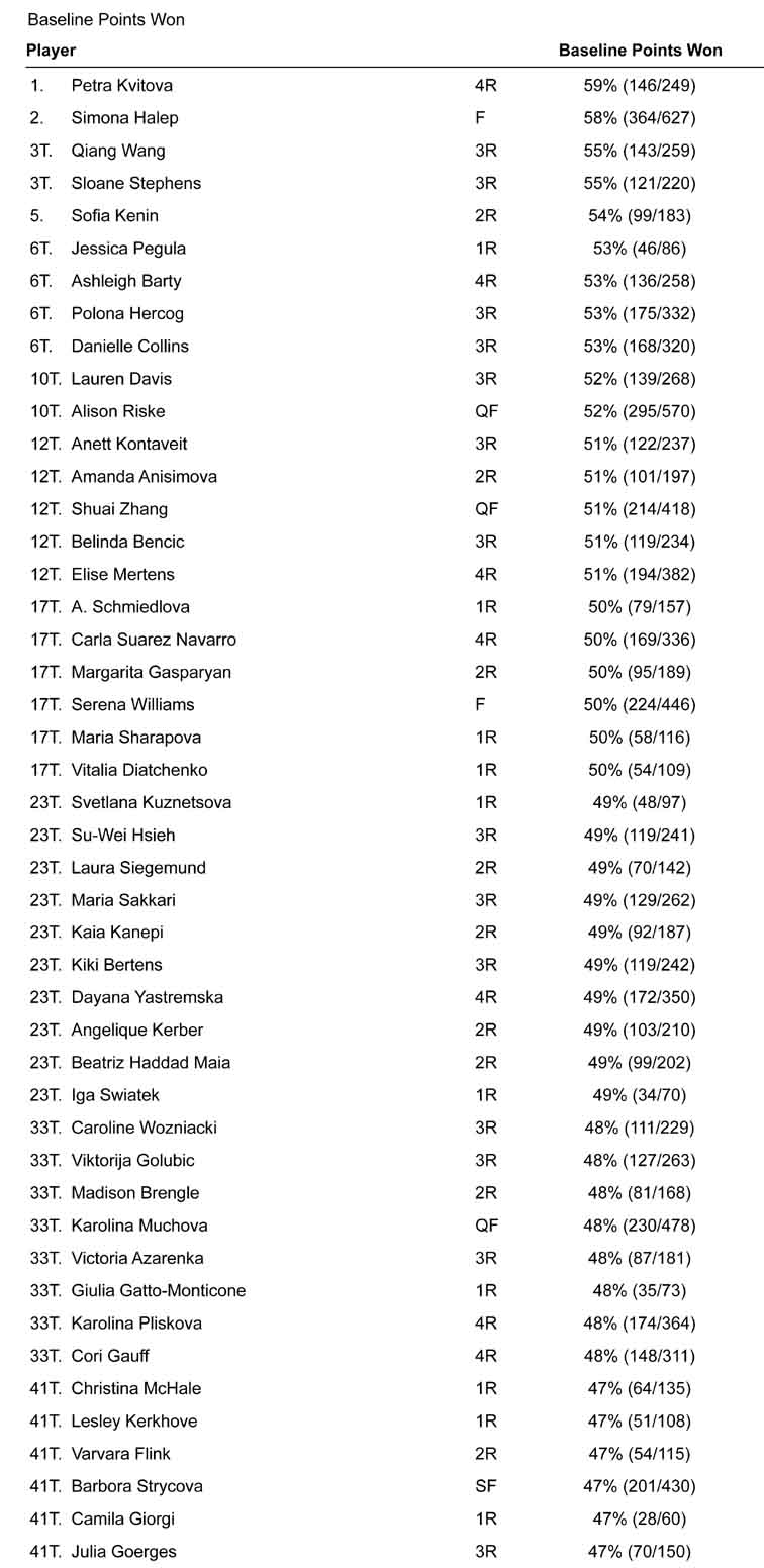 Numero uno è Petra Kvitova, che spesso ritroviamo in alto in diverse tabelle. Se però si vuole capire come mai non sia riuscita ad arrivare in fondo a questa edizione di Wimbledon occorre scoprire quale è la statistica in cui si piazza nelle retrovie: Kvitova è addirittura 120ma nelle risposte in campo (con il 62%). Dato che non sorprende visto che la risposta, soprattutto di dritto, è stata per lei una autentica palla al piede degli ultimi Championships: probabilmente il colpo che le ha impedito di raggiungere le partite decisive del torneo già vinto due volte in passato.