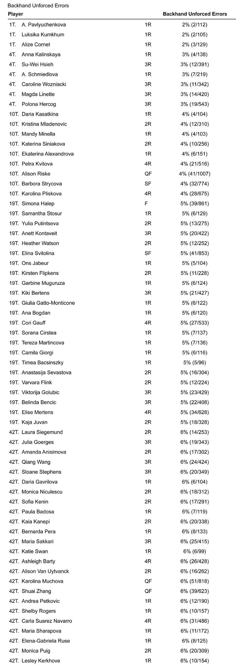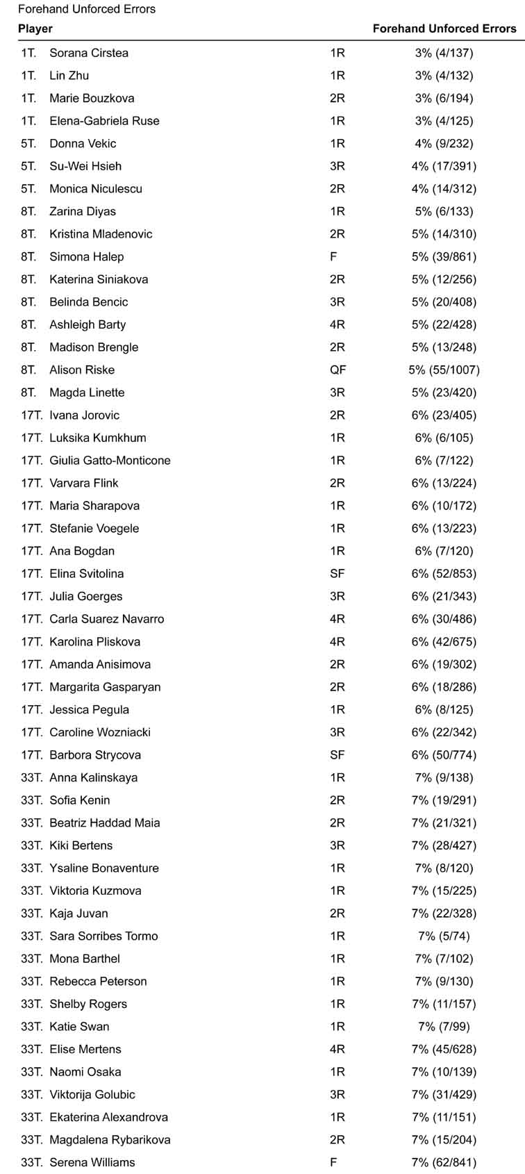 Concludono la sezione i valori scorporati. Incominciamo dagli errori non forzati di dritto. Di nuovo se depuriamo la classifica dalle giocatrici con pochi match troviamo ai vertici Simona Halep, insieme ad Alison Riske. Il dritto di Alison non sarà il più bello e ortodosso del circuito, ma evidentemente è stato molto affidabile.