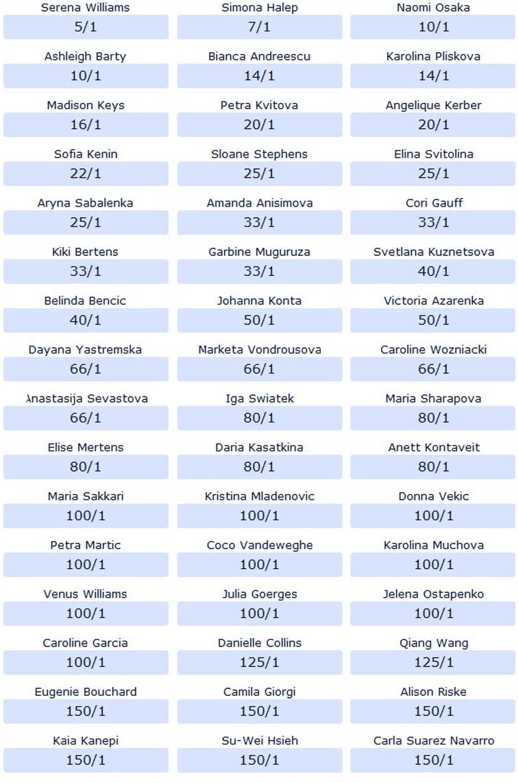 Infine le quote alla vigilia del torneo. Quelle che presento sono state rilevate lunedì 19 agosto. I bookmaker danno fiducia a Serena, anche comprensibilmente: è vero che da quando è tornata dalla maternità non ha ancora vinto un torneo, ma è già stata capace di raggiungere tre finali Slam. Seguono le tre vincitrici dei Major 2019 (Halep, Barty, Osaka) e tre giocatrici che hanno offerto dell’ottimo tennis nei tornei più recenti: Andreescu, Pliskova e Keys. E subito dietro le esperte Kerber e Kvitova, si affaccia Kenin.