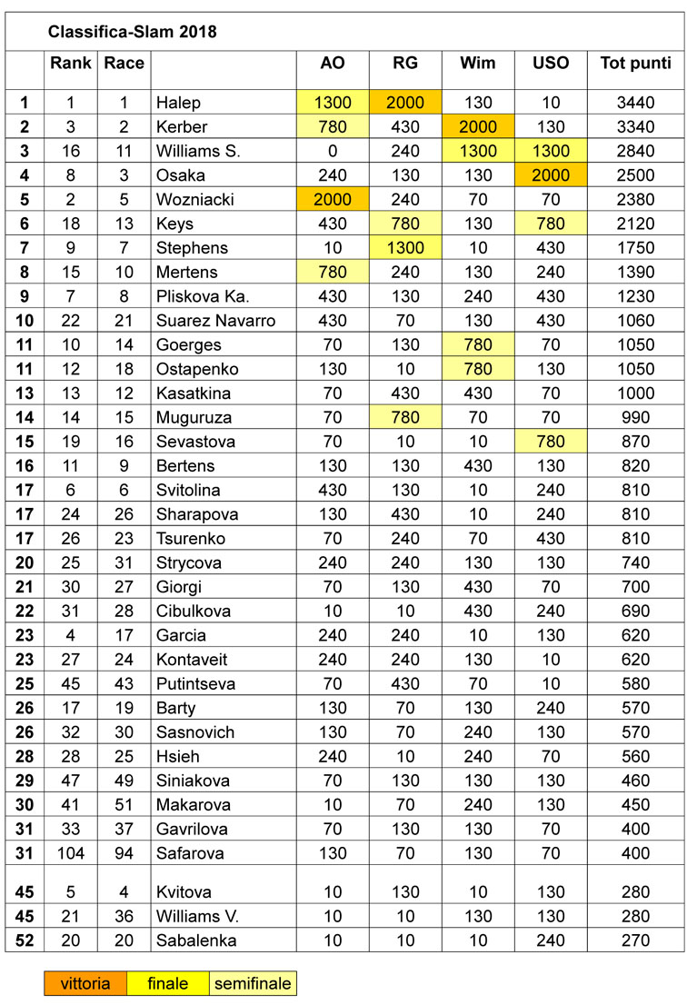 Ma c’è chi fra le giocatrici di vertice quest’anno negli Slam ha fatto peggio di Karolina. Mi riferisco a Kiki Bertens, attuale numero 8 del ranking ufficiale, che ha raccolto negli Slam 400 punti su 4225 totali: in pratica appena il 9,4%. Ed è per questo che la ritroviamo soltanto al 31 posto della classifica-Slam.