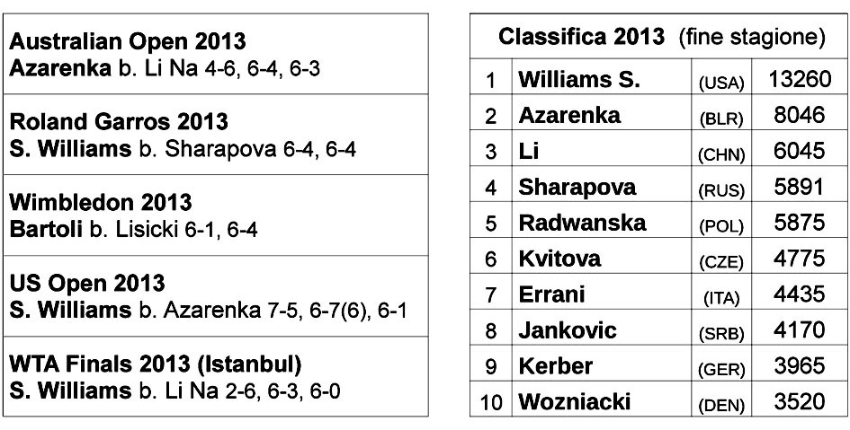 Quarto articolo dedicato agli anni ’10 del tennis femminile, che tratterà del 2013. Per la illustrazione dei criteri adottati, rimando alla introduzione del primo articolo, pubblicata martedì 26 novembre.