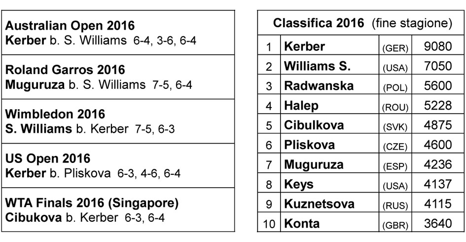 Quando finisce il 2015, malgrado il Grande Slam sfuggito in extremis, la sensazione è che il tennis WTA si possa descrivere in questo modo: una sola donna al comando, Serena Williams, e alle sue spalle posizioni incerte. Un dato fra i tanti: nella stagione appena conclusa, a parte Sharapova a Melbourne, nessuna altra finalista Slam era in quel momento Top 10. Quindi nel 2015 dietro la posizione numero 1, la situazione era stata fluida, in costante evoluzione.