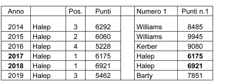 Il 2017 è anche l’anno che vede cinque diverse numero 1: Kerber, Williams, Pliskova, Muguruza, Halep. Numero 1 di fine anno sarà proprio Simona. Ma se analizziamo i numeri scopriamo che la sua leadership, più che l’esito di un progresso personale, è la conseguenza di una redistribuzione dei punti al vertice. Halep infatti dal 2014 al 2019 è la Top 5 più costante di tutte: non scende mai sotto i 5000 punti ma non raggiunge nemmeno mai i 7000. Sarà numero 1 di fine 2017 con la quota punti più bassa del decennio: Simona in sostanza continua con il suo ottimo rendimento medio-alto, e questo basta, nel 2017 e nel 2018, per diventare numero 1. Ecco una tabella che sintetizza la questione: