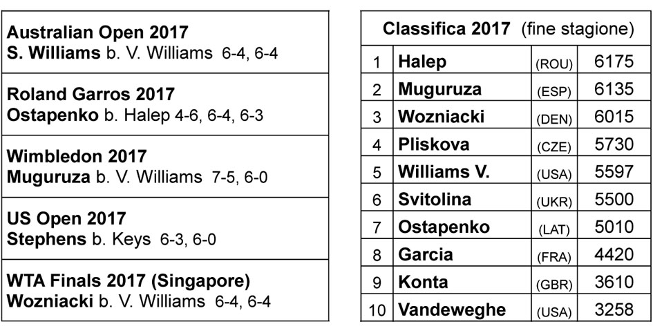 Anche senza vincere titoli, chi raccoglierà più punti negli Slam del 2017 sarà Venus Williams. Tanto che viene la tentazione di dare una interpretazione quasi psicoanalitica al risultato: senza la presenza della sorella dominante, Venus torna a dare il meglio di sé, sostituendola come figura di riferimento in famiglia e, in parte, anche nel circuito. Con due finali (Australia e Wimbledon) una semifinale (US Open) e un quarto turno (Roland Garros), più la finale al Masters, Venus è di nuovo protagonista ai massimi livelli.