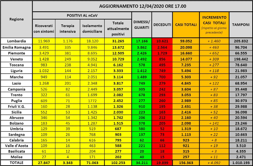 Dopo 23 giorni il dato dei nuovi decessi dovuti all’epidemia italiana di COVID-19 torna a scendere sotto quota 500: nel giorno di Pasqua, si registrano infatti 431 pazienti deceduti. La diminuzione dei nuovi casi è invece soltanto apparente, poiché sono stati analizzati meno tamponi rispetto a ieri: la percentuale delle positività rimane superiore all’8%. Rimane invece positivo il dato dei pazienti ricoverati in terapia intensiva, che sono 38 in meno di ieri: accade per il nono giorno di fila.