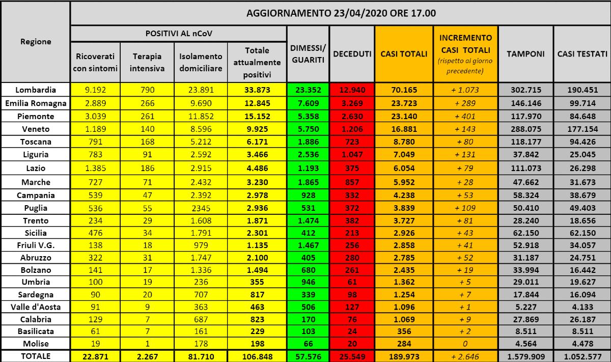 Reading: Coronavirus, i dati italiani aggiornati a giovedì 23 aprile. Calano i nuovi casi