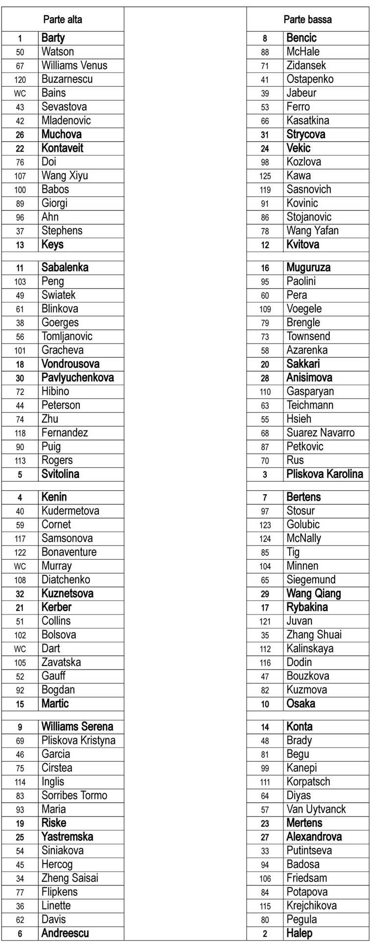 Segnalo qualche primo turno. Parte alta del tabellone. La tds 1 Barty sicuramente avrà uno dei due stadi principali, visto che trova la giocatrice di casa Watson. Interessanti Venus contro Buzarnescu, Muchova contro Mladenovic. Kerber contro Collins e Yastremska contro Siniakova. Serena comincia contro la gemella mancina Pliskova.