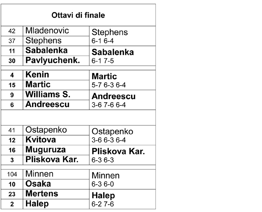 Pareggiati i conti, sullo slancio Andreescu si è portata avanti di un break all’inizio del terzo set. Poi ha perso il vantaggio, ma l’ha di nuovo riottenuto, riuscendo alla fine a chiudere 3-6, 7-6, 6-4. A conti fatti Andreescu è ancora imbattuta su tre confronti avuti con Serena Williams, e si presenta come unica Top 10 sopravvissuta nella parte alta del tabellone. Ecco il riepilogo degli ottavi di finale: