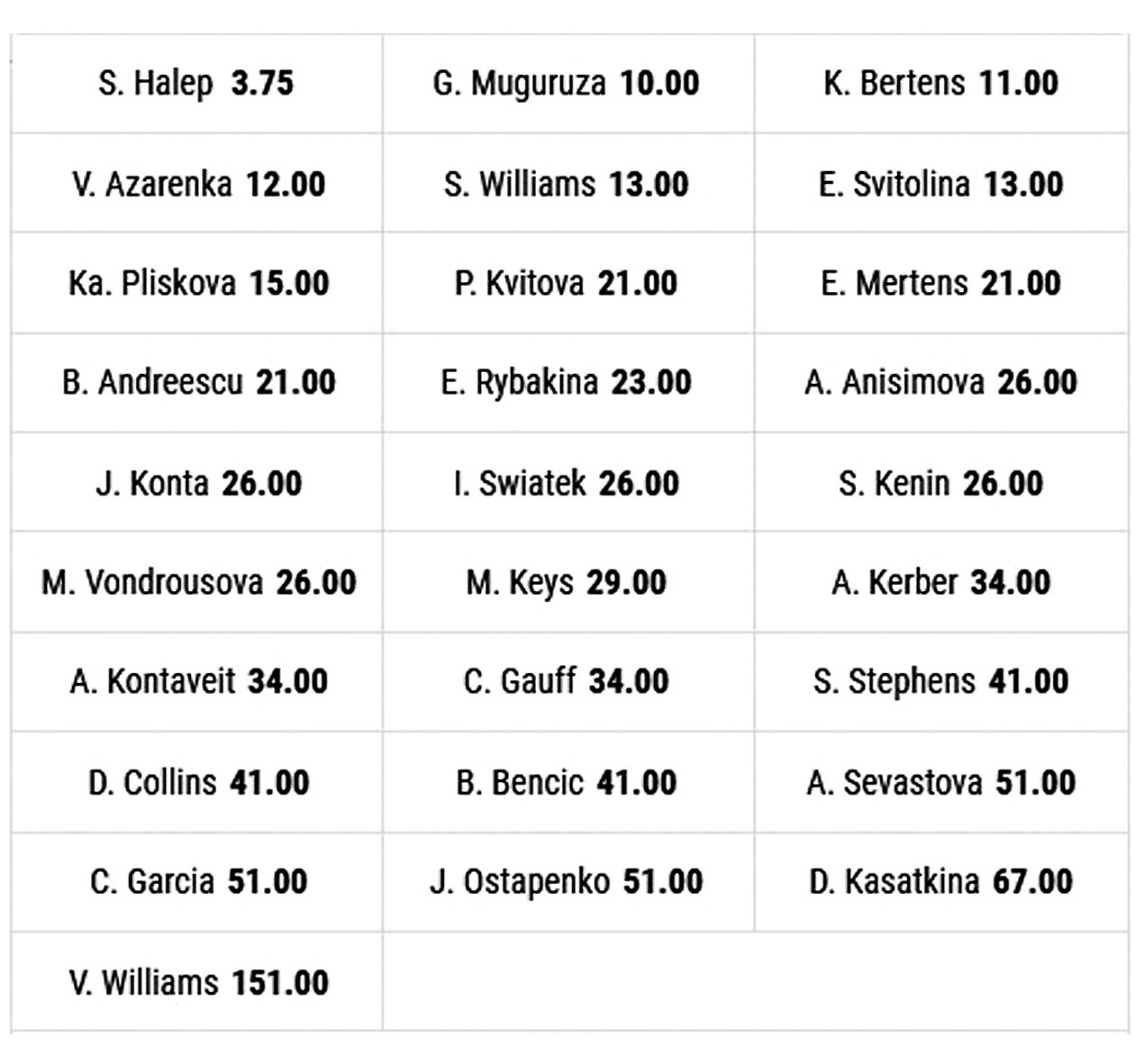 Questa volta non ci sono dubbi: Halep è nettamente favorita con un valore che paga un terzo rispetto alla prima alternativa, che è identificata in Muguruza: 3,75 contro 10. Terza favorita Bertens (al momento però una incognita) davanti ad Azarenka e Serena Williams. Non sono uno “storico” delle scommesse, ma mi domando da quanto tempo Williams non si presentava al via di uno Slam essendo considerata soltanto la quinta delle pretendenti al titolo. Non solo: mi domando anche da quanto tempo una giocatrice, Serena esclusa, non veniva quotata con un tale distacco rispetto alla seconda, come oggi Halep rispetto alle avversarie.