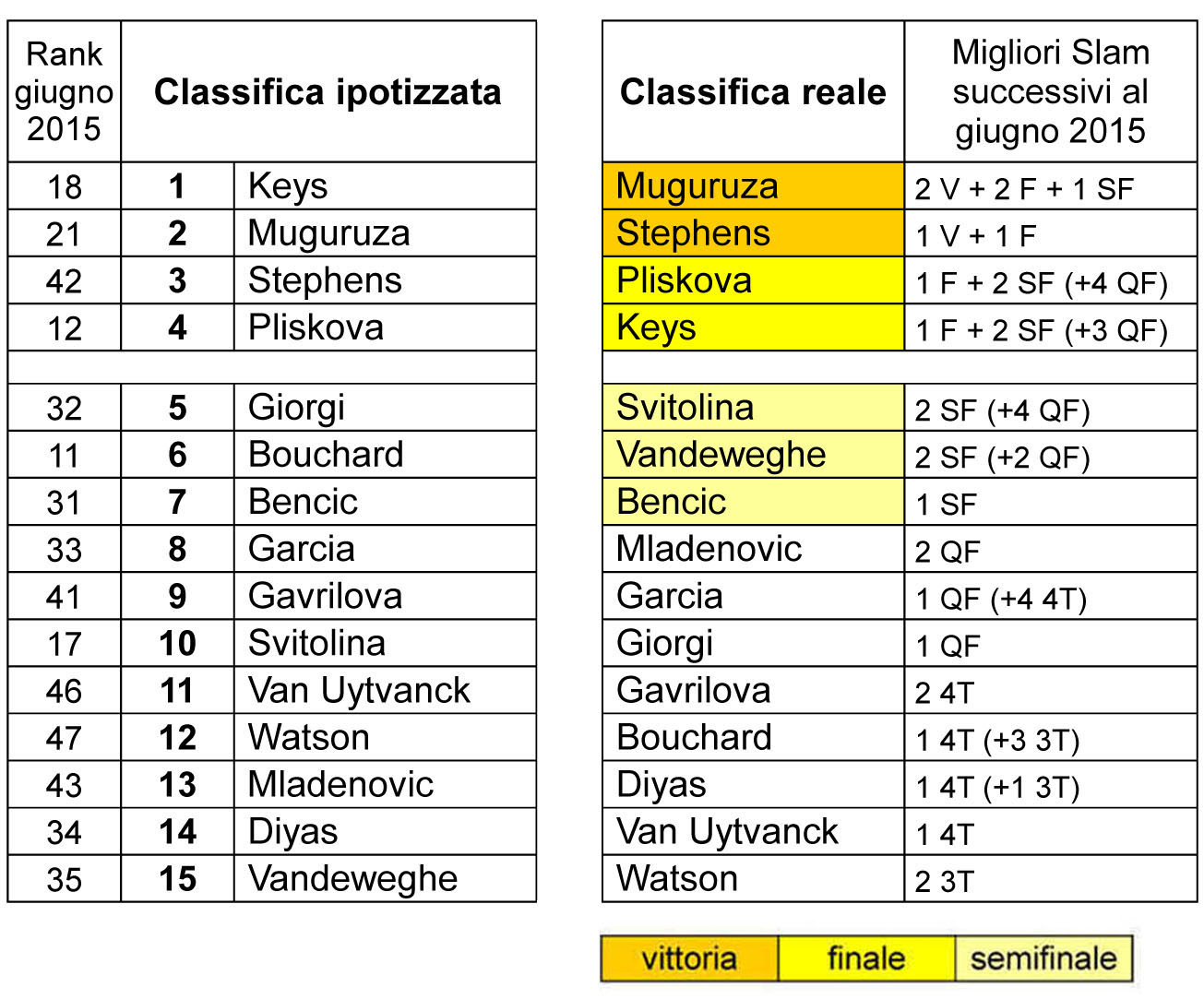 Prima di presentare la mia ipotesi, vediamo quali traguardi Slam avevano raggiunto sino ad allora le quindici giocatrici in questione. Eccole in ordine di risultati, da Eugenie Bouchard (che vantava già una finale e due semifinali, tutte conquistate nel 2014) a Daria Gavrilova, che non era mai andata oltre il secondo turno in un Major: