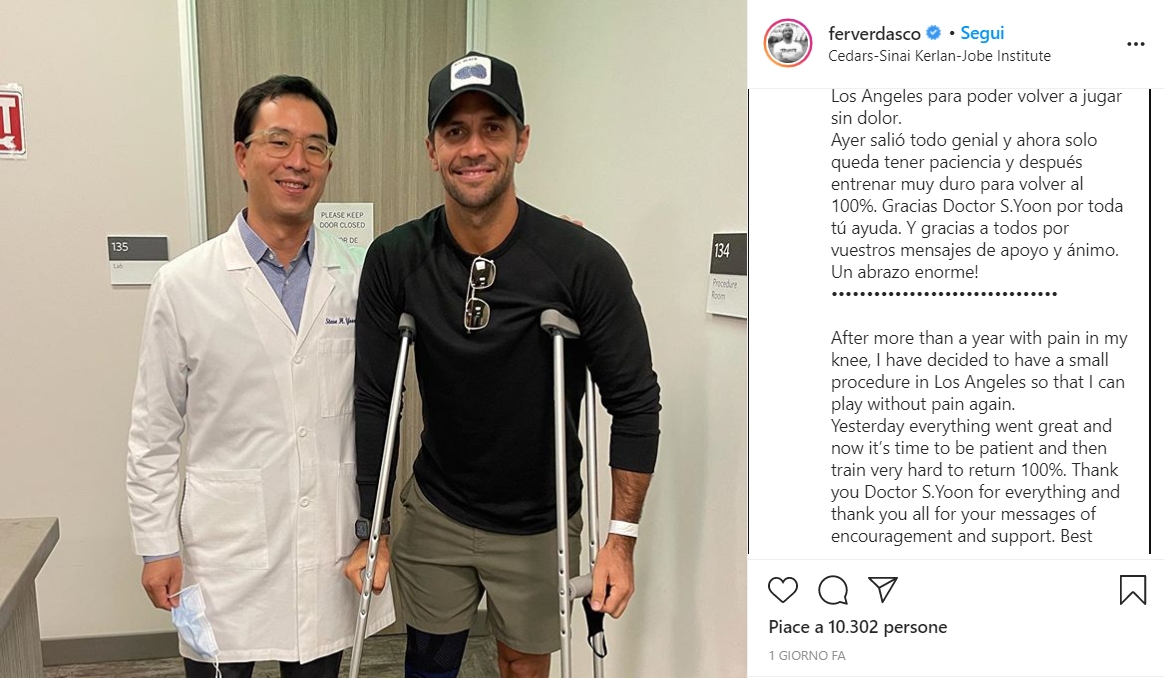 Lo avevamo lasciato una decina di giorni fa a Nur-Sultan, eliminato al secondo turno da John Millman. Questa settimana, Fernando Verdasco non era a Bercy, ma è invece volato in California per sottoporsi a un piccola operazione al ginocchio destro, da tempo fonte di dolore per il classe 1983 madrileno. Già in piedi, seppur con l’ausilio delle stampelle, e sorridente, Nando si è affidato ai social media per rassicurare i fan.