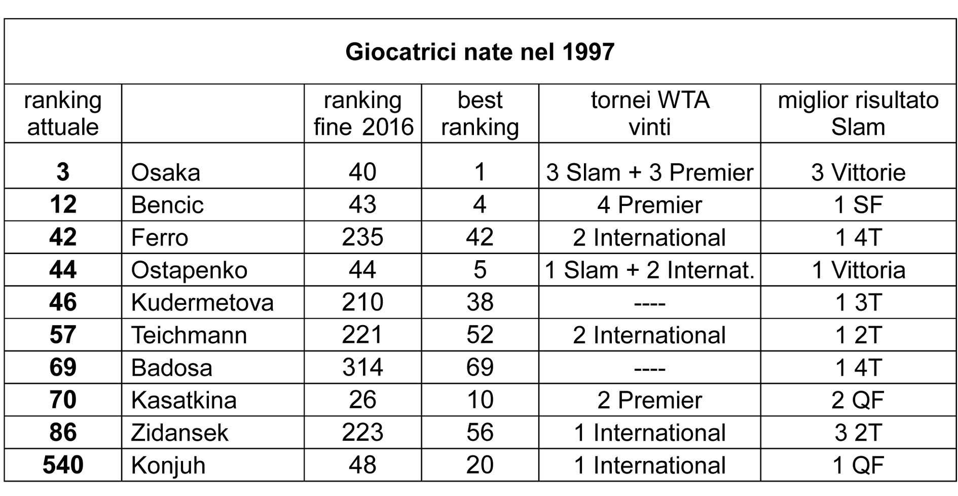 Prima di arrivare alla conclusione, può essere interessante allargare lo sguardo nei confronti dello scenario attuale. Rispetto a quattro anni fa, quando le nostre cinque protagoniste si stagliavano nettamente rispetto alle coetanee, oggi le cose sono un po’ cambiate. Altre cinque giocatrici nate nel 1997 sono fra le prime 100 del mondo. Si tratta di Fiona Ferro (attuale numero 42 WTA), Veronika Kudermetova (numero 46), Jil Teichmann (numero 56), Paula Badosa (numero 69) e Tamara Zidansek (numero 86). Ecco una tabella riassuntiva: