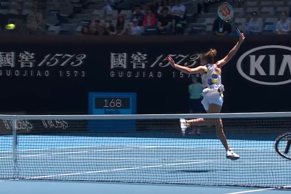 In questo match australiano, Halep riesce a fare qualcosa di un po’ diverso rispetto al suo solito: sul lungolinea di dritto di Mertens, che sarebbe vincente contro quasi tutte le avversarie, Simona arriva con un attimo di anticipo, e allora si permette di lavorare con la testa della racchetta per indirizzare non lungolinea, ma addirittura incrociato. La direzione in cross è infatti assolutamente imprendibile per Elise. Un colpo fantastico, ancora più sbalorditivo se lo si osserva al rallentatore.
