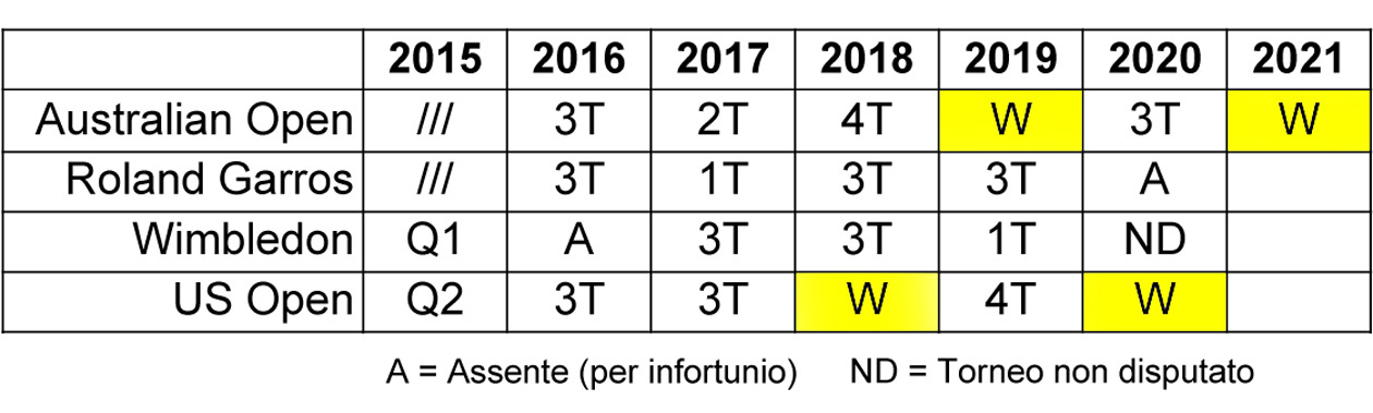Dai casi raccontati nella pagina precedente (da Radwanska a Sharapova), non si può ricavare una indicazione univoca sul futuro di Osaka al di fuori del cemento. Per cominciare ecco come sono andati tutti gli Slam nella carriera di Naomi: