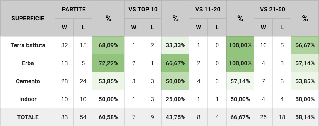 Ma dove gioca meglio il nostro numero 1? Una domanda lecita, se si considera che sinora ha vinto tre tornei sulla terra, uno sull’erba (dove nel 2019 ha anche raggiunto gli ottavi a Wimbledon) che i risultati più prestigiosi li ha ottenuti sul cemento all’aperto (semifinale allo US Open e a Shanghai) e che a livello indoor si è rivelato il primo italiano capace di vincere una partita nelle Finals. Per cercare di capirne qualcosa in più, abbiamo scomposto per superfici e per classifica gli avversari incontrati in carriera nel circuito maggiore creando la tabella che potete leggere.