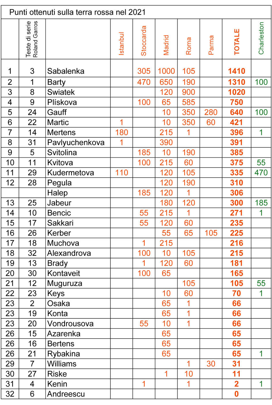 Ecco quindi i punti raccolti dalle prime 32 negli impegni sul rosso. Trovate anche, nell’ultima colonna a destra, i punteggi relativi alla terra verde di Charleston, (punteggi esclusi dal totale, limitato alla terra rossa). Nella tabella non sono conteggiati i risultati del torneo in svolgimento a Strasburgo, dove per altro, delle prime 32, sono in corsa solo Andreescu, Pegula e Alexandrova.
