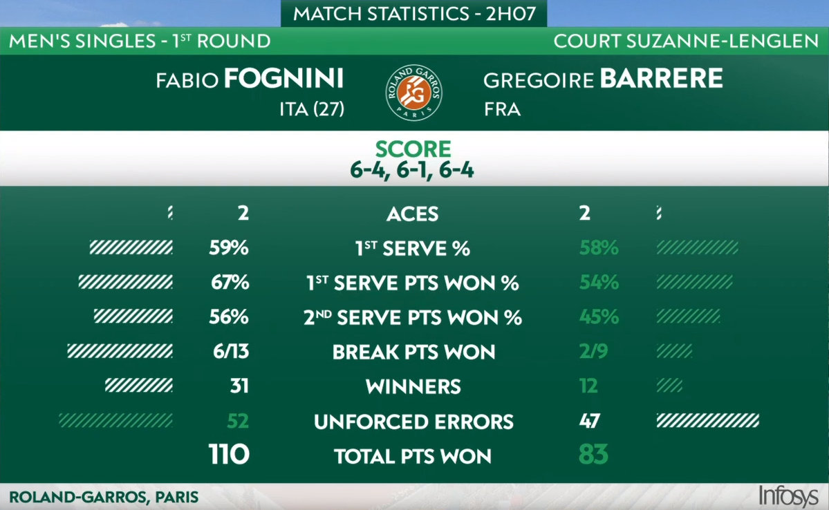Primo azzurro in campo e primo successo. Fabio Fognini ha inaugurato la campagna italiana in terra francese, superando in 3 set (6-4 6-1 6-4) dopo 2 ore e 7 minuti la wild card locale Grégoire Barrère, numero 122 del ranking. Il match del Suzanne Lenglen è iniziato con un Fognini non molto centrato ma che è riuscito ad emergere dalle difficoltà iniziale e chiudere il match, nonostante qualche passaggio a vuoto e i molti errori gratuiti (alla fine del match saranno ben 52) concentrati principalmente nel primo parziale.